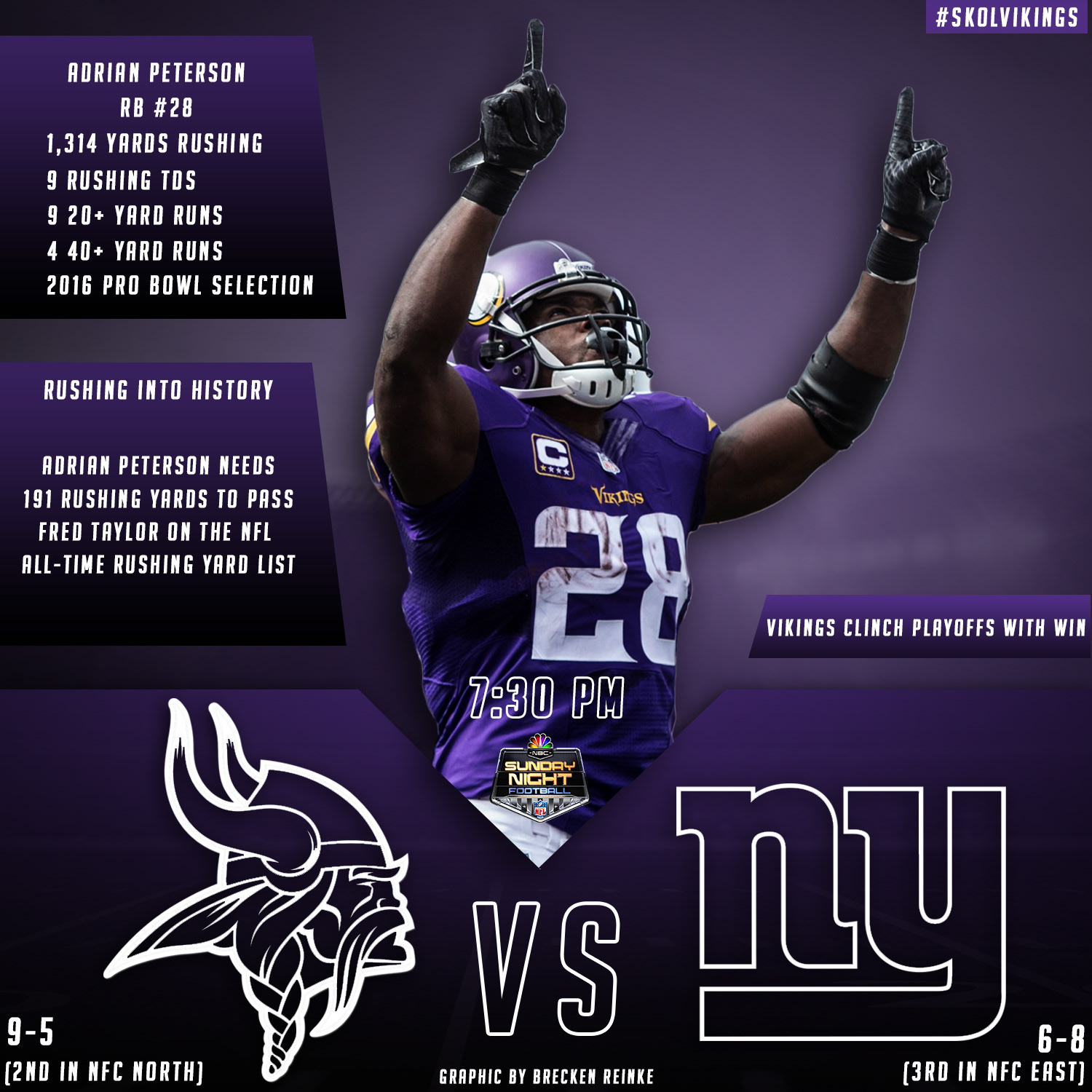 Graphic Made for the Sunday Night Football matchup between the Minnesota Vikings and the New York Giants on December 27th 2015.